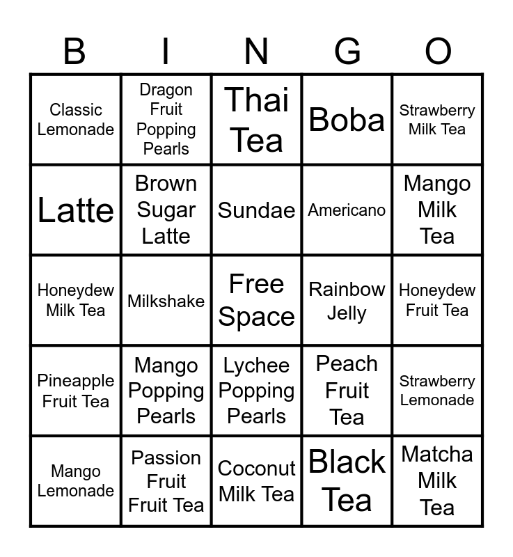 This bingo card has a free space and 44 words: Jasmine Green Tea, Matcha Milk Tea, Classic Milk Tea, Mango Lemonade, Taro Milk Tea, Black Tea, Thai Tea, Brown Sugar Milk Tea, Strawberry Milk Tea, Passion Fruit Fruit Tea, Boba, Rainbow Jelly, Lychee Popping Pearls, Mango Popping Pearls, Coconut Jelly, Coconut Milk Tea, Coffee Milk Tea, Honeydew Milk Tea, Lavender Milk Tea, Mango Milk Tea, Dragon Fruit Popping Pearls, Sour Blue Raspberry Popping Pearls, Strawberry Popping Pearls, Classic Lemonade, Dragon Fruit Lemonade, Honeydew Fruit Tea, Lychee Lemonade, Passion Fruit Lemonade, Peach Fruit Tea, Pineapple Fruit Tea, Raspberry Fruit Tea, Strawberry Lemonade, Watermelon Lemonade, Chai Tea Latte, Milkshake, Hot Cocoa, Cone, Blended Latte, Sundae, Latte, Americano, Mocha Latte, Brown Sugar Latte and Coffee Jelly.