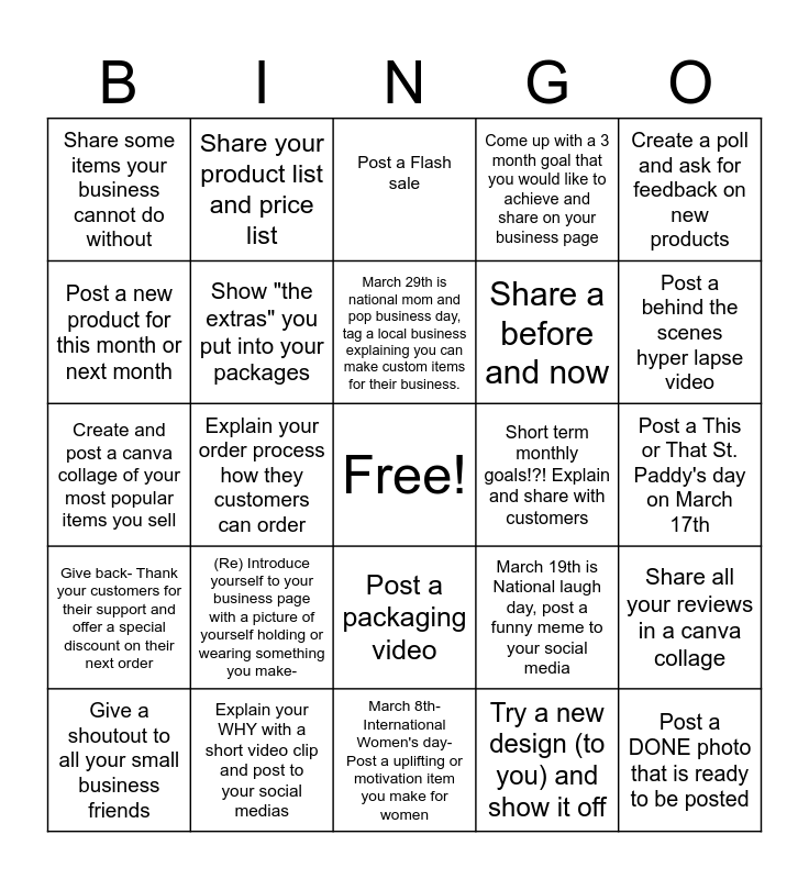 This bingo card has a free space and 24 words: (Re) Introduce yourself to your business page with a picture of yourself holding or wearing something you make-, Explain your WHY with a short video clip and post to your social medias, March 29th is national mom and pop business day, tag a local business explaining you can make custom items for their business., Give a shoutout to all your small business friends, Create a poll and ask for feedback on new products, Share some items your business cannot do without, Post a new product for this month or next month, Share your product list and price list, Short term monthly goals!?! Explain and share with customers, Post a packaging video, Share a before and now, Create and post a canva collage of your most popular items you sell, March 19th is National laugh day, post a funny meme to your social media, Share all your reviews in a canva collage, Show "the extras" you put into your packages, Try a new design (to you) and show it off, Post a This or That St. Paddy's day on March 17th, Post a Flash sale, Post a behind the scenes hyper lapse video, Explain your order process how they customers can order, Post a DONE photo that is ready to be posted, Give back- Thank your customers for their support and offer a special discount on their next order, Come up with a 3 month goal that you would like to achieve and share on your business page and March 8th- International Women's day- Post a uplifting or motivation item you make for women.