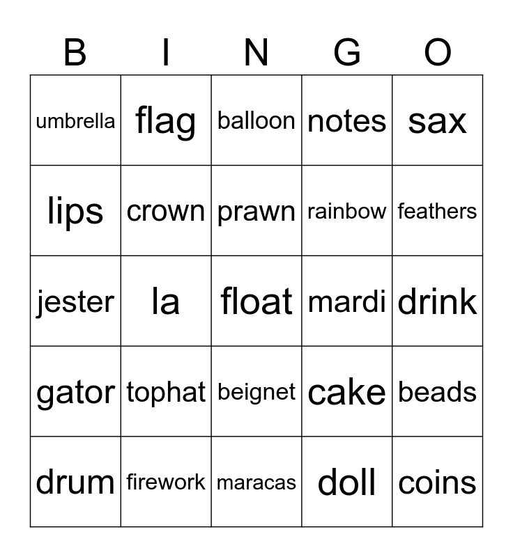 This bingo card has 36 words: Free!, mask, fleur, crown, cake, gator, prawn, hat, sax, theater, la, notes, trumpet, mardi, feathers, umbrella, coins, tophat, float, balloon, drink, beads, firework, drum, maracas, flag, jester, stars, rainbow, lips, cupcake, banner, doll, beignet, gumbo and po.