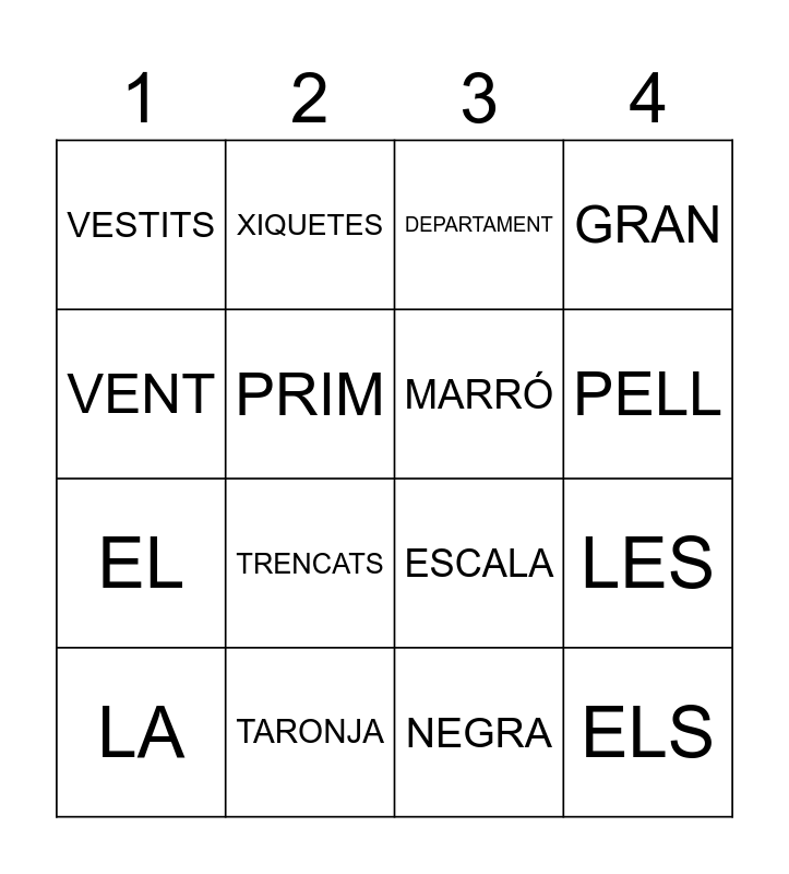 This bingo card has 16 words: TARONJA, LES, DEPARTAMENT, VESTITS, EL, XIQUETES, ESCALA, NEGRA, VENT, PRIM, LA, GRAN, TRENCATS, PELL, MARRÓ and ELS.