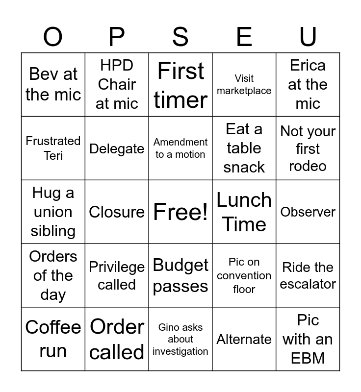 This bingo card has a free space and 24 words: Privilege called, Order called, Amendment to a motion, Coffee run, Erica at the mic, Bev at the mic, Frustrated Teri, HPD Chair at mic, Lunch Time, Budget passes, Eat a table snack, Hug a union sibling, Pic on convention floor, Ride the escalator, Delegate, Alternate, Observer, First timer, Not your first rodeo, Closure, Pic with an EBM, Orders of the day, Visit marketplace and Gino asks about investigation.