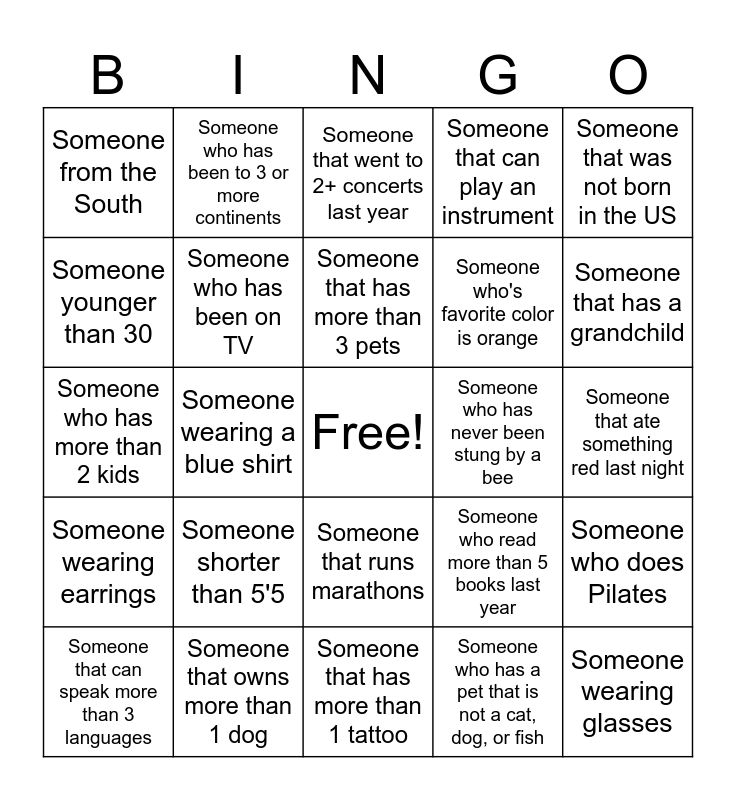 This bingo card has a free space and 24 words: Someone shorter than 5'5, Someone that owns more than 1 dog, Someone that has more than 3 pets, Someone that can speak more than 3 languages, Someone that was not born in the US, Someone from the South, Someone younger than 30, Someone who has been to 3 or more continents, Someone who has never been stung by a bee, Someone that runs marathons, Someone who's favorite color is orange, Someone who has more than 2 kids, Someone who read more than 5 books last year, Someone who does Pilates, Someone who has been on TV, Someone who has a pet that is not a cat, dog, or fish, Someone that ate something red last night, Someone that went to 2+ concerts last year, Someone that has a grandchild, Someone wearing a blue shirt, Someone wearing glasses, Someone wearing earrings, Someone that can play an instrument and Someone that has more than 1 tattoo.