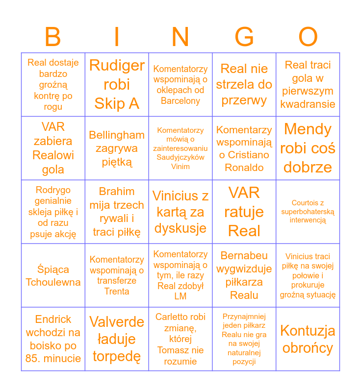 This bingo card has 26 words: Komentatorzy wspominają o tym, ile razy Real zdobył LM, Przynajmniej jeden piłkarz Realu nie gra na swojej naturalnej pozycji, Komentatorzy mówią o zainteresowaniu Saudyjczyków Vinim, Valverde ładuje torpedę, Real traci gola w pierwszym kwadransie, Real dostaje bardzo groźną kontrę po rogu, VAR zabiera Realowi gola, Rudiger robi Skip A, Courtois z superbohaterską interwencją, Bernabeu wygwizduje piłkarza Realu, Komentarzy wspominają o Cristiano Ronaldo, Rodrygo genialnie skleja piłkę i od razu psuje akcję, Vinicius traci piłkę na swojej połowie i prokuruje groźną sytuację, Endrick wchodzi na boisko po 85. minucie, Brahim mija trzech rywali i traci piłkę, Kylian na spalonym, Real nie strzela do przerwy, Śpiąca Tchoulewna, Komentatorzy wspominają o oklepach od Barcelony, Vinicius z kartą za dyskusje, Mendy robi coś dobrze, Carletto robi zmianę, której Tomasz nie rozumie, VAR ratuje Real, Komentatorzy wspominają o transferze Trenta, Bellingham zagrywa piętką and Kontuzja obrońcy.