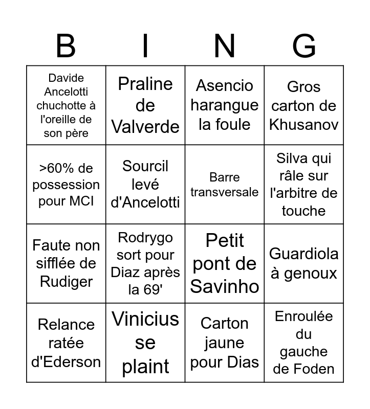 This bingo card has 16 words: Vinicius se plaint, Guardiola à genoux, Asencio harangue la foule, Davide Ancelotti chuchotte à l'oreille de son père, Faute non sifflée de Rudiger, Praline de Valverde, Petit pont de Savinho, Carton jaune pour Dias, >60% de possession pour MCI, Sourcil levé d'Ancelotti, Relance ratée d'Ederson, Gros carton de Khusanov, Rodrygo sort pour Diaz après la 69', Silva qui râle sur l'arbitre de touche, Barre transversale and Enroulée du gauche de Foden.