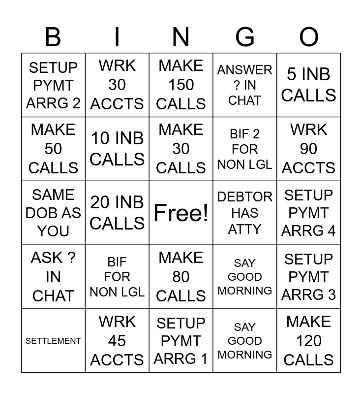 This bingo card has a free space and 25 words: BIF FOR NON LGL, SETUP PYMT ARRG 1, MAKE 30 CALLS, SETTLEMENT, 5 INB CALLS, SETUP PYMT ARRG 2, MAKE 50 CALLS, WRK 30 ACCTS, DEBTOR HAS ATTY, MAKE 80 CALLS, BIF 2 FOR NON LGL, SAME DOB AS YOU, SAY GOOD MORNING, SETUP PYMT ARRG 3, 10 INB CALLS, WRK 60 ACCTS, SETUP PYMT ARRG 4, MAKE 150 CALLS, WRK 90 ACCTS, 20 INB CALLS, MAKE 120 CALLS, WRK 45 ACCTS, ASK ? IN CHAT, ANSWER ? IN CHAT and SAY GOOD MORNING.