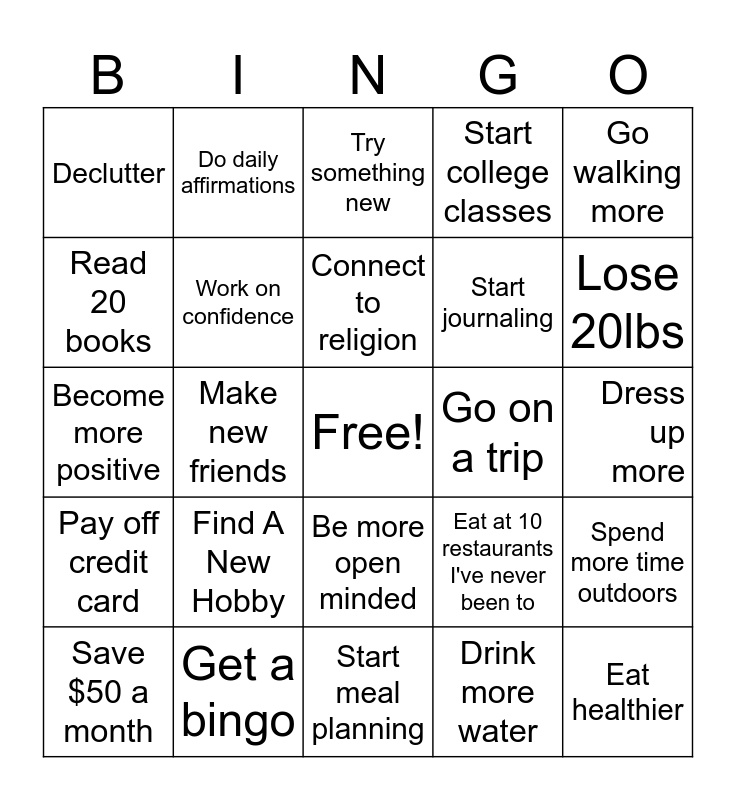 This bingo card has a free space and 24 words: Find A New Hobby, Get a bingo, Connect to religion, Save $50 a month, Go walking more, Declutter, Read 20 books, Do daily affirmations, Go on a trip, Be more open minded, Start journaling, Become more positive, Eat at 10 restaurants I've never been to, Spend more time outdoors, Work on confidence, Drink more water, Dress up more, Try something new, Lose 20lbs, Make new friends, Eat healthier, Pay off credit card, Start college classes and Start meal planning.
