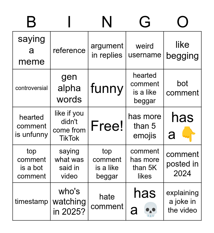 This bingo card has a free space and 24 words: saying what was said in video, who's watching in 2025?, funny, timestamp, like begging, saying a meme, controversial, reference, has more than 5 emojis, top comment is a like beggar, hearted comment is a like beggar, hearted comment is unfunny, comment has more than 5K likes, comment posted in 2024, gen alpha words, has a 💀, has a 👇, argument in replies, bot comment, like if you didn't come from TikTok, explaining a joke in the video, top comment is a bot comment, weird username and hate comment.