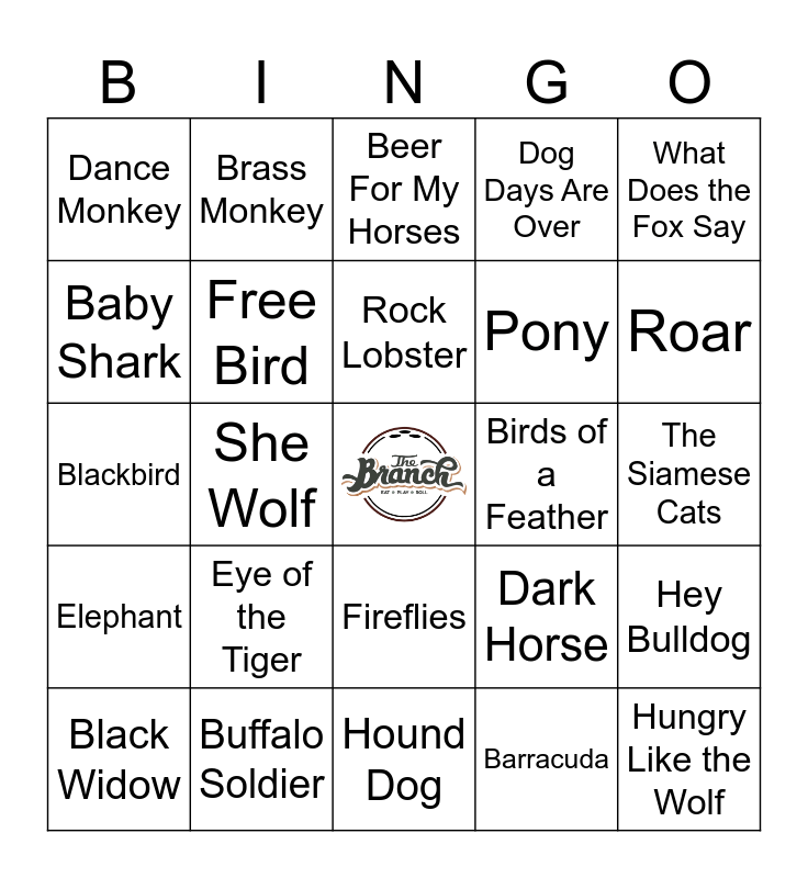 This bingo card has a free space and 50 words: Who Let The Dogs Out, Hungry Like the Wolf, Crocodile Rock, Hound Dog, Eye of the Tiger, The Lion Sleeps Tonight, Brass Monkey, Three Little Birds, Baby Shark, When Doves Cry, Free Bird, Dog Days Are Over, Hey Bulldog, Dark Horse, Save a Horse (Ride a Cowboy), Anaconda, Rock Lobster, Birds of a Feather, Bluebird, What Does the Fox Say, She Wolf, Barracuda, Dance Monkey, Pony, Who Am I? (What’s My Name), Monkey Wrench, Roar, Animals, Beer For My Horses, Fireflies, Foxey Lady, Honey Bee, Karma Chameleon, Rockin’ Robin, Buffalo Soldier, Black Cat, Puppy Love, I’m Like a Bird, Black Horse and The Cherry Tree, The Siamese Cats, The Pink Panther, Butterfly, High Horse, White Horse, Black Widow, Blackbird, I Love My Dog, Kitty Girl, Elephant and Pink Pony Club.