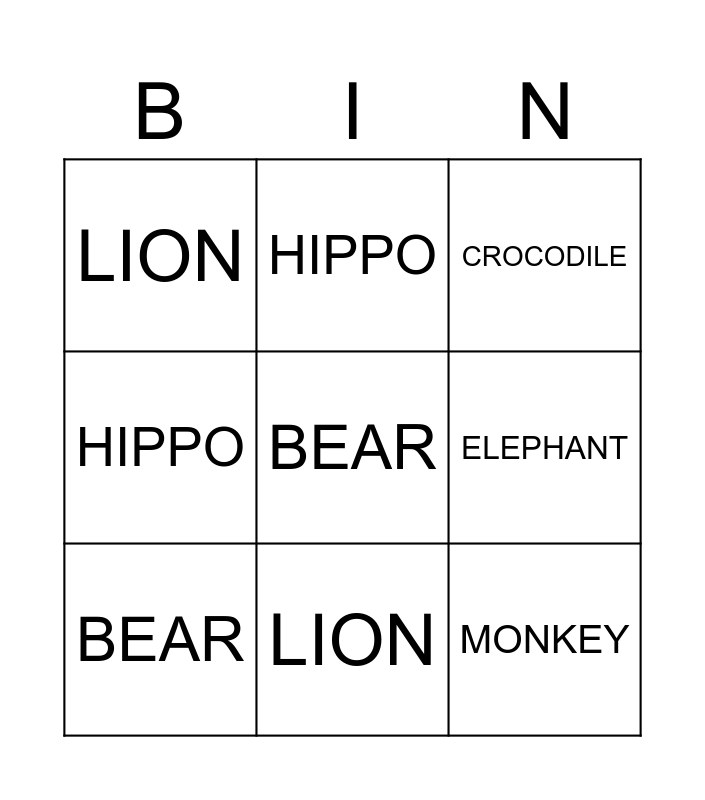 This bingo card has a free space and 19 words: Free!, GIRAFFE, CROCODILE, ELEPHANT, SNAKE, MONKEY, TIGER, LION, HIPPO, CROCODILE, GIRAFFE, ELEPHANT, BEAR, SNAKE, MONKEY, TIGER, HIPPO, LION and PARROT.