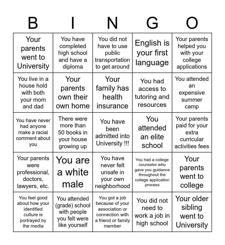This bingo card has a free space and 24 words: You are a white male, You attended (grade) school with people you felt were like yourself, Your family has health insurance, You feel good about how your identified culture is portrayed by the media, Your parents helped you with your college applications, Your parents went to University, You live in a house hold with both your mom and dad, You have completed high school and have a diploma, You attended an elite school, You have never felt unsafe in your own neighborhood, You had access to tutoring and resources, You have never had anyone make a racial comment about you, You had a college counselor who gave you guidance throughout the college application process, Your parents went to college, Your parents own their own home, You did not need to work a job in high school, Your parents paid for your extra curricular activities fees, You did not have to use public transportation to get around, You attended an expensive summer camp, There were more than 50 books in your house growing up, Your older sibling went to University, Your parents were professional, doctors, lawyers, etc., English is your first language and You got a job because of your association or connection with a friend or family member.