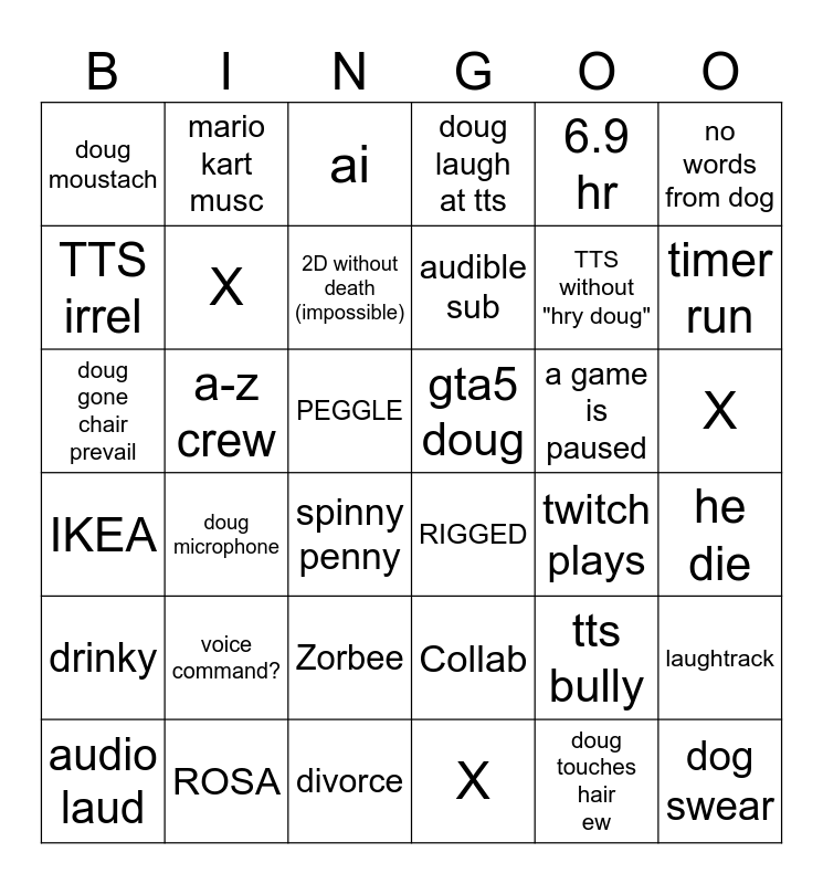 This bingo card has 36 words: Collab, Zorbee, X, TTS irrel, IKEA, gta5 doug, X, divorce, 6.9 hr, tts bully, timer run, doug laugh at tts, laughtrack, a-z crew, audible sub, doug moustach, drinky, a game is paused, doug gone chair prevail, ai, PEGGLE, doug microphone, RIGGED, spinny penny, twitch plays, mario kart musc, TTS without "hry doug", ROSA, 2D without death (impossible), no words from dog, dog swear, audio laud, he die, X, voice command? and doug touches hair ew.