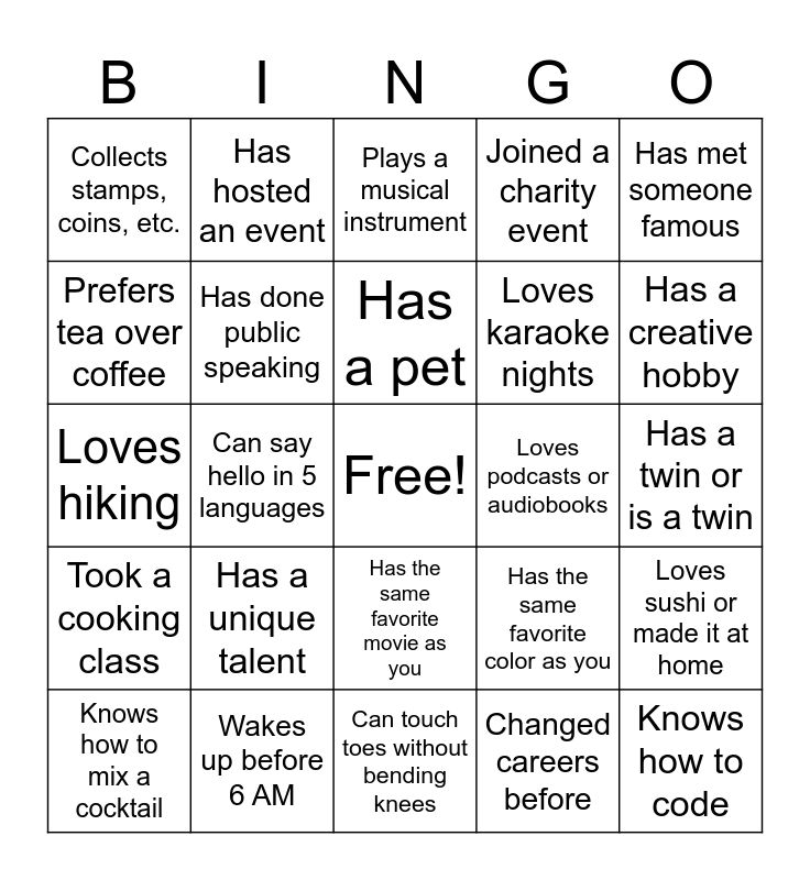 This bingo card has a free space and 75 words: Speaks 2+ languages, Traveled to 5+ countries, Plays a musical instrument, Loves spicy food, Works in a different field, Has the same birth month as you, Has run a marathon, Can cook a signature dish, Has met a celebrity, Worked 5+ years at one company, Attended a networking event, Loves reading fiction, Has a pet, Prefers tea over coffee, Lived in 3+ different cities, Can say hello in 5 languages, Has a side hustle, Knows how to code, Worked remotely from abroad, Has met someone famous, Can whistle a tune, Loves hiking, Has done public speaking, Has hosted an event, Joined a charity event, Can name 3 Finnish people, Visited a Scandinavian country, Loves board games, Worked in hospitality, Can sing or perform, Loves documentaries, Knows a cultural dance, Had a long-distance relationship, Has the same favorite color as you, Has a creative hobby, Loves karaoke nights, Appeared in media (TV, news, etc.), Enjoys gardening, Has a twin or is a twin, Changed careers before, Attended a concert last year, Is wearing something blue, Worked in an international team, Joined a hackathon or challenge, Can do a cool trick, Has won a competition, Knows how to mix a cocktail, Collects stamps, coins, etc., Prefers dogs over cats (or vice versa), Can recite a poem or quote, Worked in 3+ jobs, Has the same favorite movie as you, Can juggle or do magic tricks, Tried scuba diving or snorkeling, Attended a pro sports game, Knows 3 countries starting with "S", Did volunteer work abroad, Attended a wedding overseas, Prefers summer over winter, Has never broken a bone, Has a unique talent, Spoke on a podcast or radio, Knows Finland’s capital city, Joined a cultural festival, Tried exotic food, Loves podcasts or audiobooks, Stayed awake 24+ hours, Visited a rooftop bar, Can name 5 Oscar-winning films, Loves sushi or made it at home, Took a cooking class, Wakes up before 6 AM, Worked in sales or marketing, Can touch toes without bending knees and Attended a costume party.