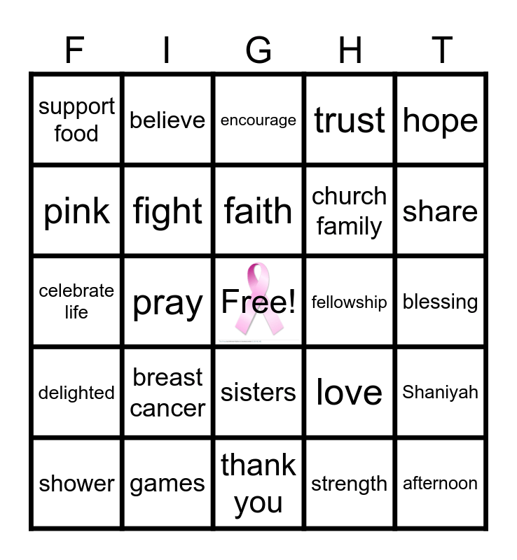 This bingo card has a free space and 24 words: breast cancer, games, faith, shower, hope, support food, pink, believe, fellowship, sisters, church family, celebrate life, love, Shaniyah, fight, strength, blessing, encourage, share, pray, afternoon, delighted, trust and thank you.
