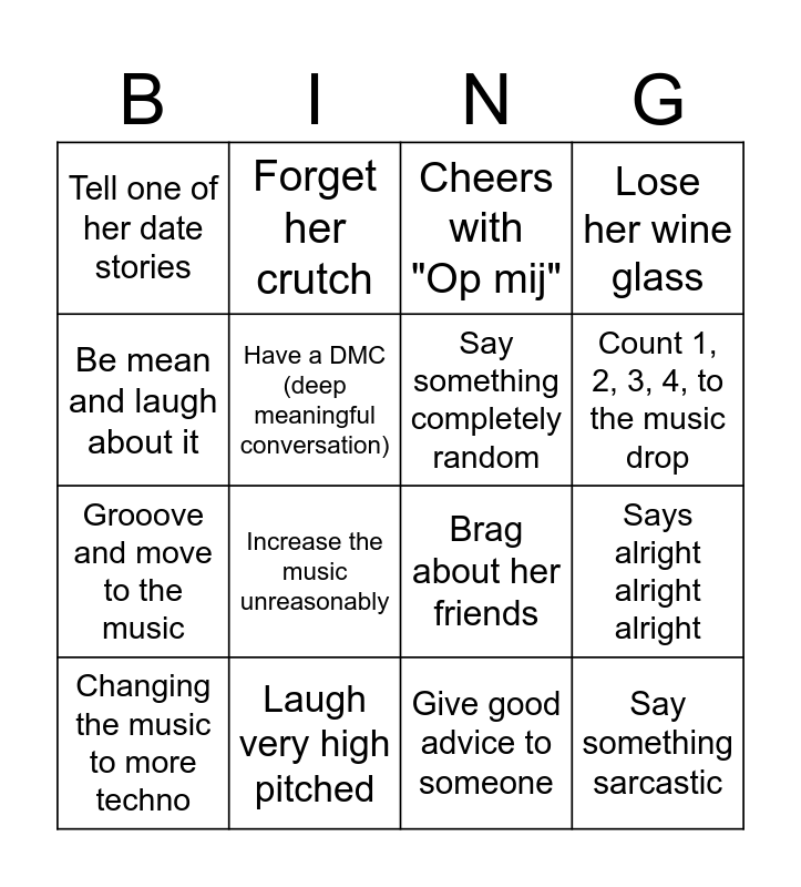 This bingo card has 16 words: Laugh very high pitched, Says alright alright alright, Cheers with "Op mij", Tell one of her date stories, Grooove and move to the music, Forget her crutch, Brag about her friends, Give good advice to someone, Be mean and laugh about it, Have a DMC (deep meaningful conversation), Changing the music to more techno, Lose her wine glass, Increase the music unreasonably, Count 1, 2, 3, 4, to the music drop, Say something completely random and Say something sarcastic.