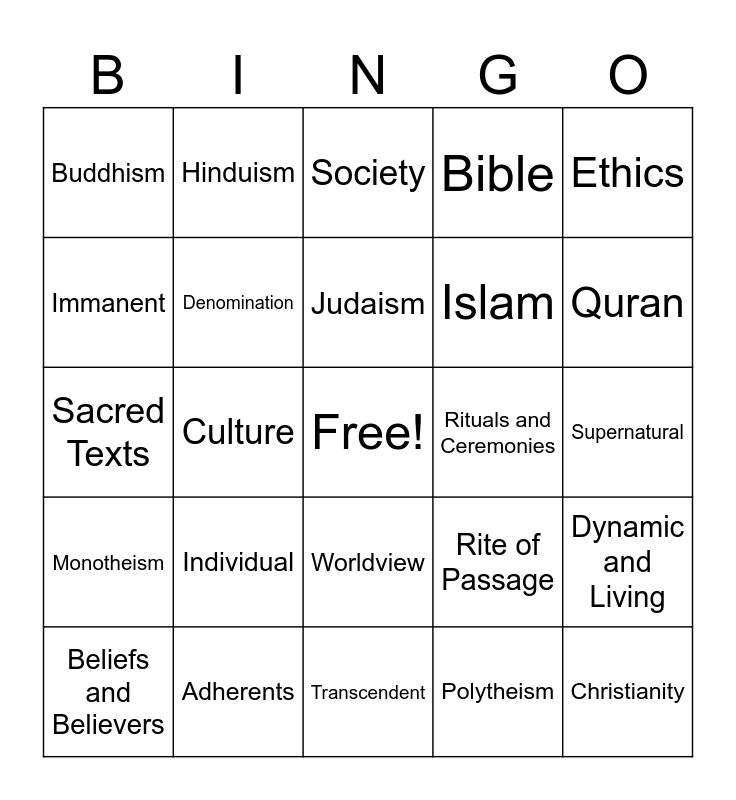 This bingo card has a free space and 24 words: Individual, Adherents, Judaism, Beliefs and Believers, Ethics, Buddhism, Immanent, Hinduism, Rituals and Ceremonies, Worldview, Islam, Sacred Texts, Rite of Passage, Dynamic and Living, Denomination, Polytheism, Supernatural, Society, Quran, Culture, Christianity, Monotheism, Bible and Transcendent.