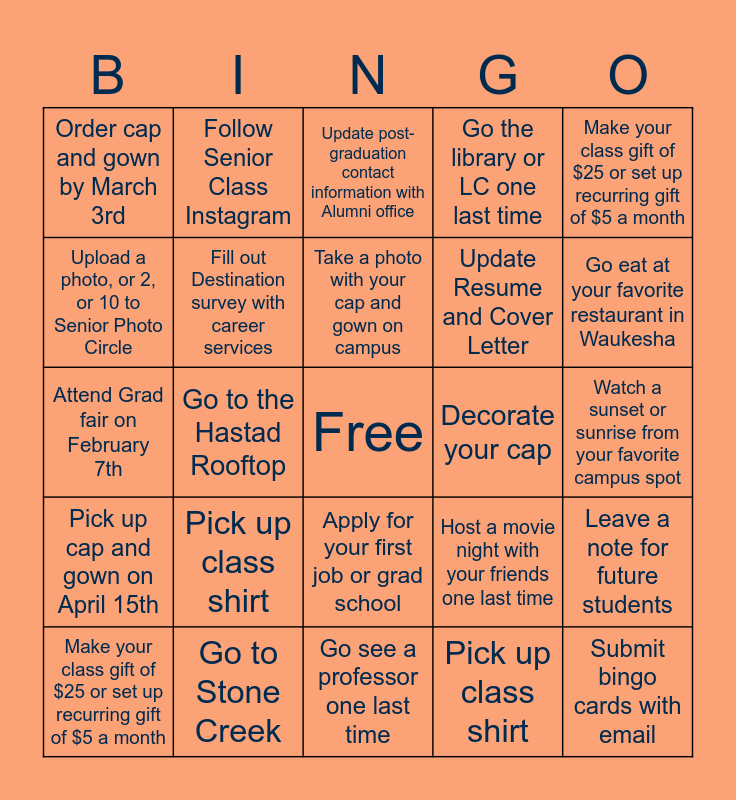 This bingo card has a free space and 24 words: Make your class gift of $25 or set up recurring gift of $5 a month, Pick up class shirt, Take a photo with your cap and gown on campus, Pick up class shirt, Make your class gift of $25 or set up recurring gift of $5 a month, Order cap and gown by March 3rd, Follow Senior Class Instagram, Update post-graduation contact information with Alumni office, Decorate your cap, Watch a sunset or sunrise from your favorite campus spot, Attend Grad fair on February 7th, Fill out Destination survey with career services, Host a movie night with your friends one last time, Leave a note for future students, Upload a photo, or 2, or 10 to Senior Photo Circle, Go to Stone Creek, Go see a professor one last time, Go the library or LC one last time, Go eat at your favorite restaurant in Waukesha, Pick up cap and gown on April 15th, Go to the Hastad Rooftop, Apply for your first job or grad school, Update Resume and Cover Letter and Submit bingo cards with email.