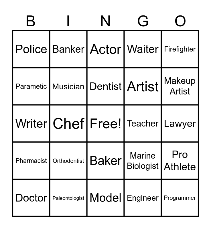 This bingo card has a free space and 24 words: Orthodontist, Paleontologist, Dentist, Doctor, Firefighter, Police, Parametic, Banker, Teacher, Baker, Artist, Writer, Marine Biologist, Pro Athlete, Musician, Engineer, Lawyer, Actor, Makeup Artist, Chef, Programmer, Pharmacist, Waiter and Model.