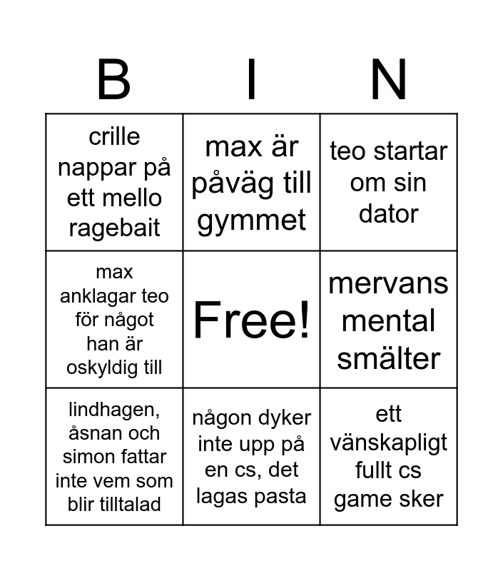 This bingo card has a free space and 8 words: mervans mental smälter, teo startar om sin dator, max är påväg till gymmet, lindhagen, åsnan och simon fattar inte vem som blir tilltalad, crille nappar på ett mello ragebait, ett vänskapligt fullt cs game sker, max anklagar teo för något han är oskyldig till and någon dyker inte upp på en cs, det lagas pasta.