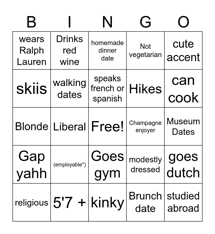 This bingo card has a free space and 24 words: (employable*), 5'7 +, speaks french or spanish, religious, cute accent, wears Ralph Lauren, skiis, Drinks red wine, Champagne enjoyer, Goes gym, Hikes, Blonde, modestly dressed, goes dutch, walking dates, Brunch date, Museum Dates, homemade dinner date, can cook, Liberal, studied abroad, Gap yahh, Not vegetarian and kinky.
