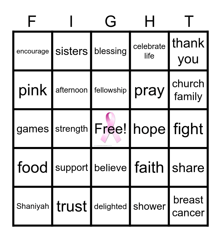 This bingo card has a free space and 25 words: support, delighted, fellowship, Shaniyah, thank you, encourage, pink, sisters, hope, believe, pray, games, faith, share, afternoon, love, fight, blessing, church family, strength, breast cancer, trust, food, celebrate life and shower.