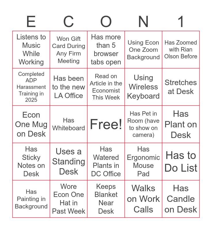 This bingo card has a free space and 41 words: Member of ESOP, Econ One Mug on Desk, Follows Econ One on LinkedIn, Has been to the new LA Office, Wore Econ One Hat in Past Week, Has Watered Plants in DC Office, Read on Article in the Economist This Week, Is Currently Wearing Econ One Hoodie, Has Zoomed with Rian Olson Before, Has Sticky Notes on Desk, Has Whiteboard, Using Econ One Zoom Background, Has Candle on Desk, Has Plant on Desk, Has Pet in Room (have to show on camera), Uses a Standing Desk, Using Earphones/Earbuds, Listens to Music While Working, Calculator on Desk, Has more than 5 browser tabs open, Has to Do List, Wearing Blue Light Glasses, Keeps Blanket Near Desk, Using Wireless Keyboard, Doodles in notepad, Stress ball on desk, Walks on Work Calls, Forgotten What Day of Week it Is, Stretches at Desk, Drinks from Reusable Water Bottle, Participated in 2024 Wellness Challenge, Won Gift Card During Any Firm Meeting, Has Painting in Background, Plays Sports in Free Time, Has Ergonomic Mouse Pad, Completed ADP Harassment Training in 2025, Worked at Econ One for 10 Years, Prefers Taking Notes on Paper, Prefer Podcasts to Music, Taught Econ Class and Worked with ESS in 2024.