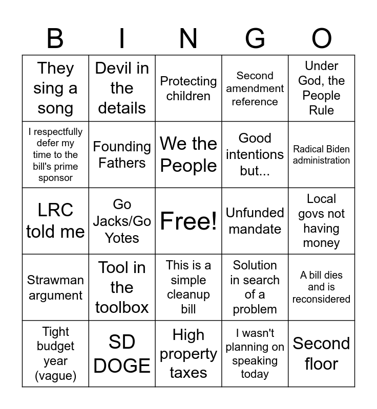 This bingo card has a free space and 34 words: Local control, I wasn't planning on speaking today, I'll be brief, Not ready for primetime, Strawman argument, Founding Fathers, Under God, the People Rule, Tight budget year (vague), Devil in the details, Sausage making, We the People, Protecting children, This bill is about freedom, Traditional South Dakota values, Unfunded mandate, Radical Biden administration, SD DOGE, LRC told me, Tool in the toolbox, Solution in search of a problem, This is a simple cleanup bill, I'm not a lawyer/in my law practice, They sing a song, Local govs not having money, High property taxes, Second floor, Second amendment reference, Over 10 personal privileges, Good intentions but..., I respectfully defer my time to the bill's prime sponsor, Vote green/red, Go Jacks/Go Yotes, A bill dies and is reconsidered and Unintended consequences.