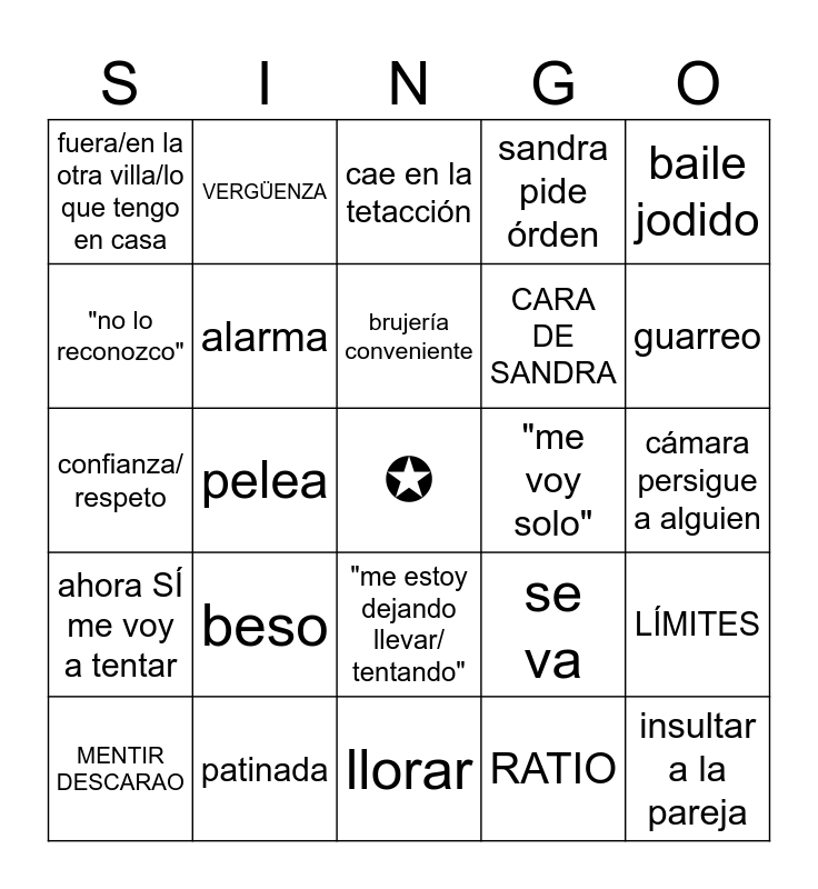 This bingo card has a free space and 39 words: polvo, "porque lo he sentido", romper o lanzar algo (o intentarlo), alarma, MENTIR DESCARAO, "me estoy dejando llevar/ tentando", brujería conveniente, ASCO, baile jodido, ahora SÍ me voy a tentar, pelea, sandra pide órden, insultar a la pareja, cámara persigue a alguien, "me voy solo", beso, conexión, fuera/en la otra villa/lo que tengo en casa, sandra rompe papel, se va, "no lo reconozco", llorar, CARA DE SANDRA, guarreo, liada, RANDOM EVENT, machistada, absoluto cringe, planes de futuro, VERGÜENZA, necesito verlo/a.., HIELITO, cae en la tetacción, patinada, RATIO, rare W, LÍMITES, confianza/ respeto and tentación.