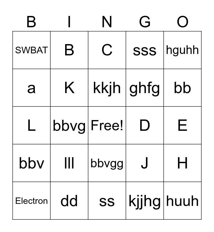 This bingo card has a free space and 24 words: Electron, lll, kkjh, kjjhg, hguhh, SWBAT, B, C, D, E, L, K, J, H, a, dd, ss, sss, bb, bbv, bbvg, bbvgg, ghfg and huuh.