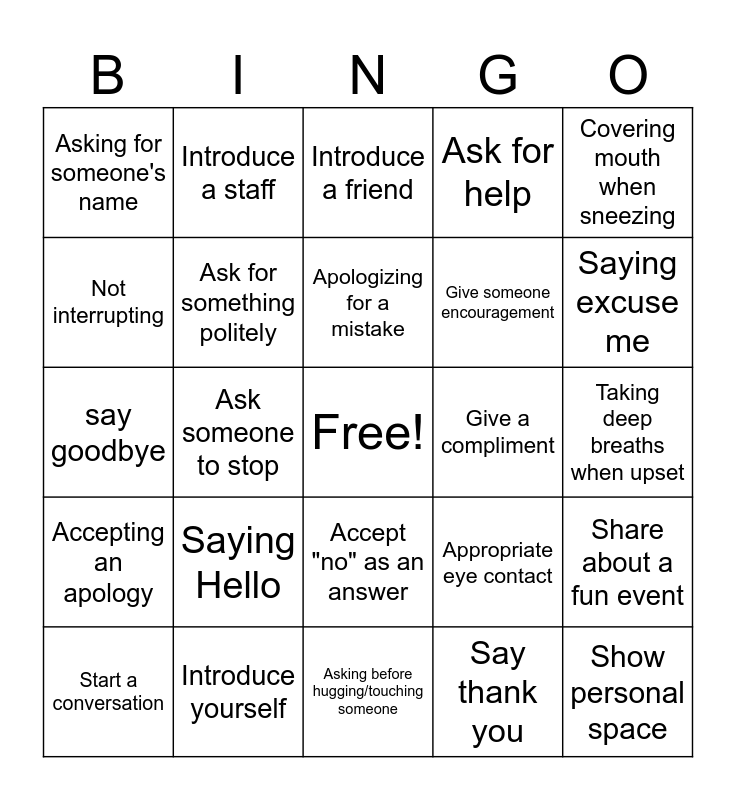 This bingo card has a free space and 24 words: Saying Hello, Introduce yourself, Apologizing for a mistake, Start a conversation, Covering mouth when sneezing, Asking for someone's name, Not interrupting, Introduce a staff, Give a compliment, Accept "no" as an answer, Give someone encouragement, say goodbye, Appropriate eye contact, Share about a fun event, Ask for something politely, Say thank you, Taking deep breaths when upset, Introduce a friend, Saying excuse me, Ask someone to stop, Show personal space, Accepting an apology, Ask for help and Asking before hugging/touching someone.