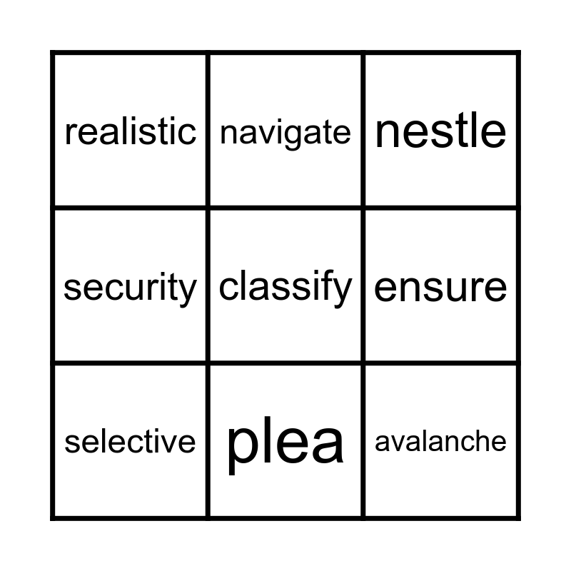 This bingo card has 12 words: absurd, avalanche, classify, ensure, navigate, nestle, plea, principle, realistic, security, selective and tart.