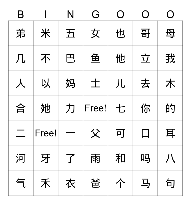 This bingo card has a free space and 48 words: 和, 立, 爸, 她, 妈, 的, 米, 禾, 哥, 父, 母, 女, 去, 儿, 河, 你, 几, 我, 吗, 也, 他, 力, 弟, 不, 八, 巴, 木, 气, 土, 以, 马, 七, 耳, 牙, 合, 可, 口, 人, 一, 了, 二, 句, 五, 衣, 鱼, 雨, Free! and 个.