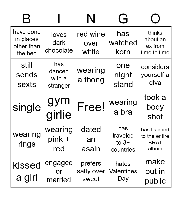 This bingo card has a free space and 24 words: wearing pink + red, engaged or married, wearing a thong, kissed a girl, thinks about an ex from time to time, have done in places other than the bed, still sends sexts, loves dark chocolate, wearing a bra, dated an asain, one night stand, single, has traveled to 3+ countries, has listened to the entire BRAT album, has danced with a stranger, hates Valentines Day, took a body shot, red wine over white, considers yourself a diva, gym girlie, make out in public, wearing rings, has watched korn and prefers salty over sweet.
