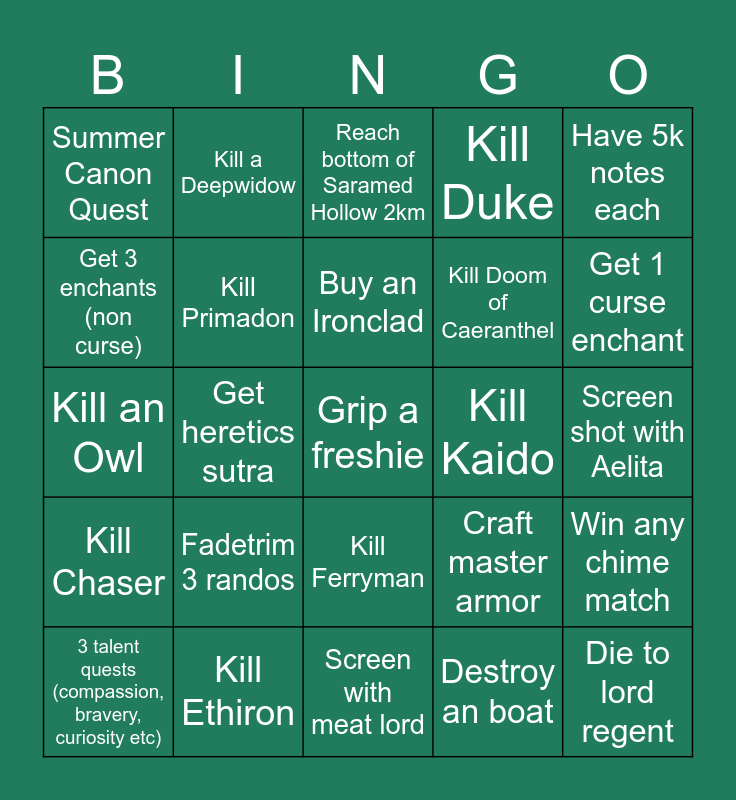 This bingo card has a free space and 24 words: Fadetrim 3 randos, Kill Ethiron, Buy an Ironclad, 3 talent quests (compassion, bravery, curiosity etc), Have 5k notes each, Summer Canon Quest, Get 3 enchants (non curse), Kill a Deepwidow, Kill Kaido, Kill Ferryman, Kill Doom of Caeranthel, Kill an Owl, Craft master armor, Win any chime match, Kill Primadon, Destroy an boat, Screen shot with Aelita, Reach bottom of Saramed Hollow 2km, Get 1 curse enchant, Get heretics sutra, Die to lord regent, Kill Chaser, Kill Duke and Screen with meat lord.