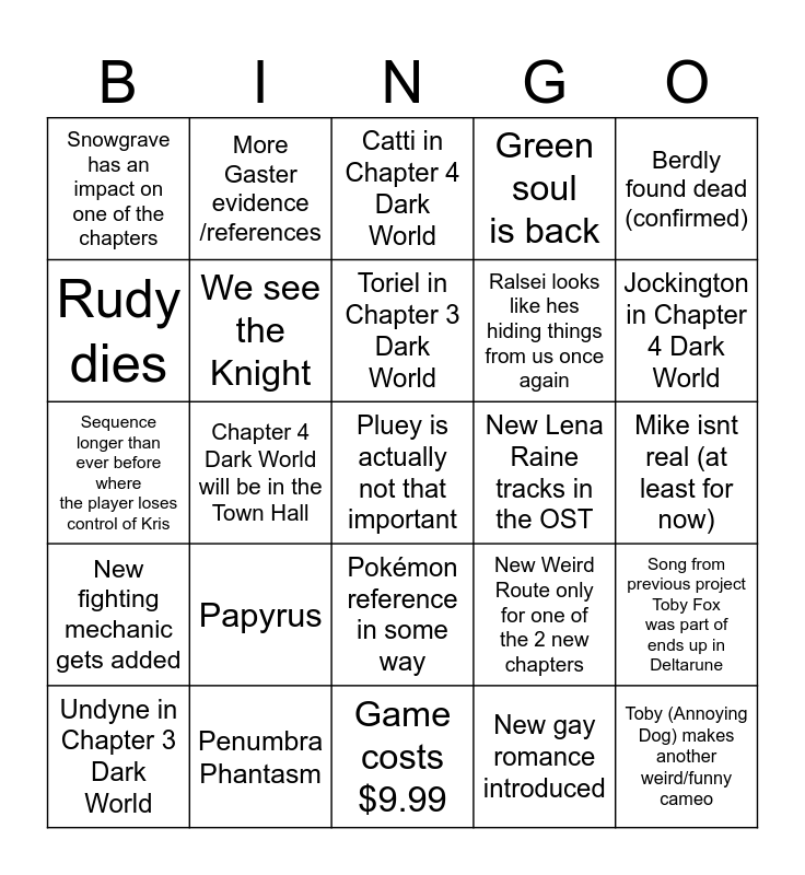 This bingo card has a free space and 24 words: Papyrus, Penumbra Phantasm, Toriel in Chapter 3 Dark World, Undyne in Chapter 3 Dark World, Berdly found dead (confirmed), Snowgrave has an impact on one of the chapters, Rudy dies, More Gaster evidence /references, New Lena Raine tracks in the OST, Pokémon reference in some way, Ralsei looks like hes hiding things from us once again, Sequence longer than ever before where the player loses control of Kris, New Weird Route only for one of the 2 new chapters, Song from previous project Toby Fox was part of ends up in Deltarune, We see the Knight, New gay romance introduced, Mike isnt real (at least for now), Catti in Chapter 4 Dark World, Jockington in Chapter 4 Dark World, Chapter 4 Dark World will be in the Town Hall, Toby (Annoying Dog) makes another weird/funny cameo, New fighting mechanic gets added, Green soul is back and Game costs $9.99.