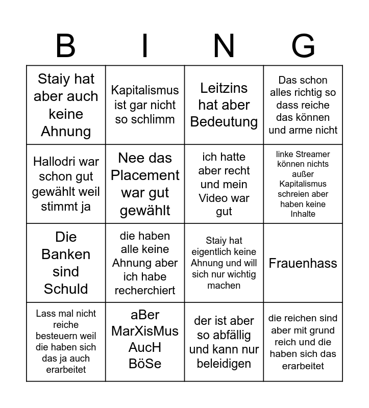 This bingo card has 16 words: aBer MarXisMus AucH BöSe, Frauenhass, Leitzins hat aber Bedeutung, Staiy hat aber auch keine Ahnung, Die Banken sind Schuld, Kapitalismus ist gar nicht so schlimm, Staiy hat eigentlich keine Ahnung und will sich nur wichtig machen, der ist aber so abfällig und kann nur beleidigen, Hallodri war schon gut gewählt weil stimmt ja, Nee das Placement war gut gewählt, Lass mal nicht reiche besteuern weil die haben sich das ja auch erarbeitet, Das schon alles richtig so dass reiche das können und arme nicht, die haben alle keine Ahnung aber ich habe recherchiert, linke Streamer können nichts außer Kapitalismus schreien aber haben keine Inhalte, ich hatte aber recht und mein Video war gut and die reichen sind aber mit grund reich und die haben sich das erarbeitet.