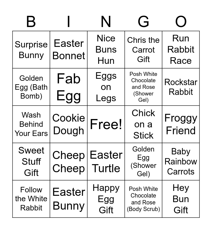 This bingo card has a free space and 24 words: Cheep Cheep, Easter Bunny, Eggs on Legs, Follow the White Rabbit, Run Rabbit Race, Surprise Bunny, Golden Egg (Bath Bomb), Easter Bonnet, Chick on a Stick, Easter Turtle, Posh White Chocolate and Rose (Shower Gel), Wash Behind Your Ears, Golden Egg (Shower Gel), Baby Rainbow Carrots, Fab Egg, Posh White Chocolate and Rose (Body Scrub), Froggy Friend, Nice Buns Hun, Rockstar Rabbit, Cookie Dough, Hey Bun Gift, Sweet Stuff Gift, Chris the Carrot Gift and Happy Egg Gift.