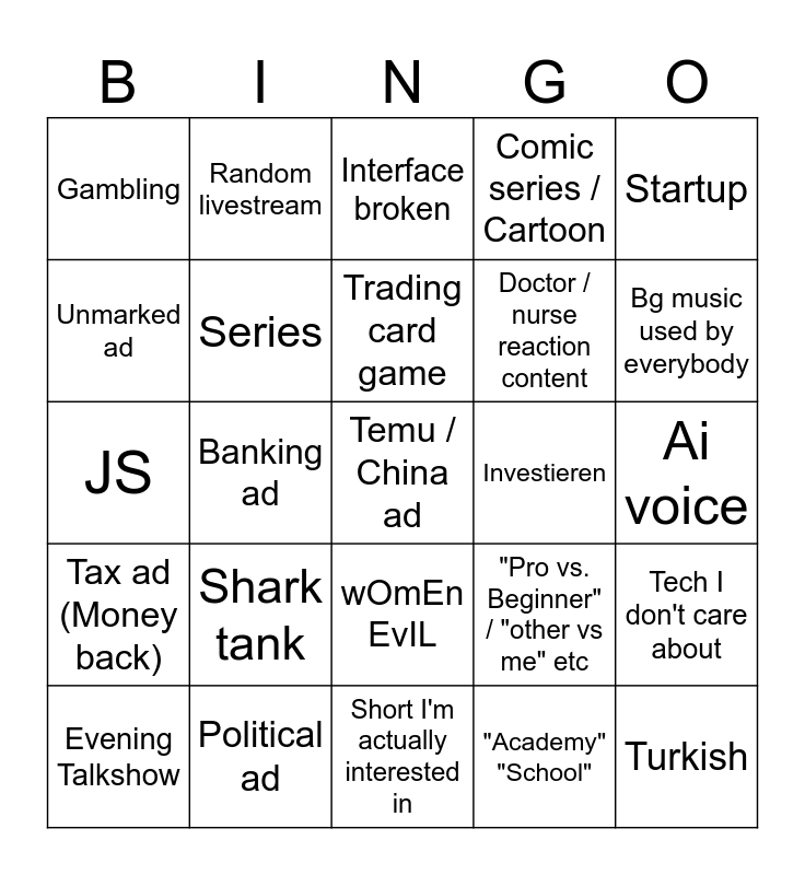 This bingo card has a free space and 43 words: "Epic" music, Banking ad, Simpsons, "Academy" "School", Black text, white BG meme, Evening Talkshow, Series, Cops, Comic series / Cartoon, Family guy, Gambling, Shark tank, "Pro vs. Beginner" / "other vs me" etc, Tech I don't care about, Dating app, Police, "Abnehm geheimnis", Investieren, Fake reaction on bg, JS, Random livestream, Ai, Russian, Startup, Randomized channel name, Political ad, wOmEn EvIL, 1. 2. 3. 4. Meme list, Turkish, Tax ad (Money back), Movie excerpt, Trading card game, Yard sale / flipping, Ai voice, Ad with anime girls, Random gaming, Short I'm actually interested in, Doctor / nurse reaction content, Bg music used by everybody, Unmarked ad, Flashbang, Interface broken and 18+.