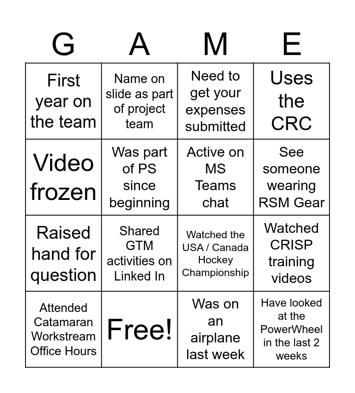 This bingo card has 24 words: Joined meeting early, On Camera for entire meeting, See someone wearing RSM Gear, Have been with firm over 7 years, Video frozen, First year on the team, Was part of PS since beginning, Name on slide as part of project team, Free!, Volunteered for Co-Pilot Challenge, Raised hand for question, Watched the USA / Canada Hockey Championship, add a GIF to chat, Went into the office for this meeting, Active on MS Teams chat, Talking on Mute, Was on an airplane last week, Need to get your expenses submitted, Shared GTM activities on Linked In, Watched CRISP training videos, Attended Catamaran Workstream Office Hours, Have looked at the PowerWheel in the last 2 weeks, Uses the CRC and Submitted a SNAP ticket in last week.