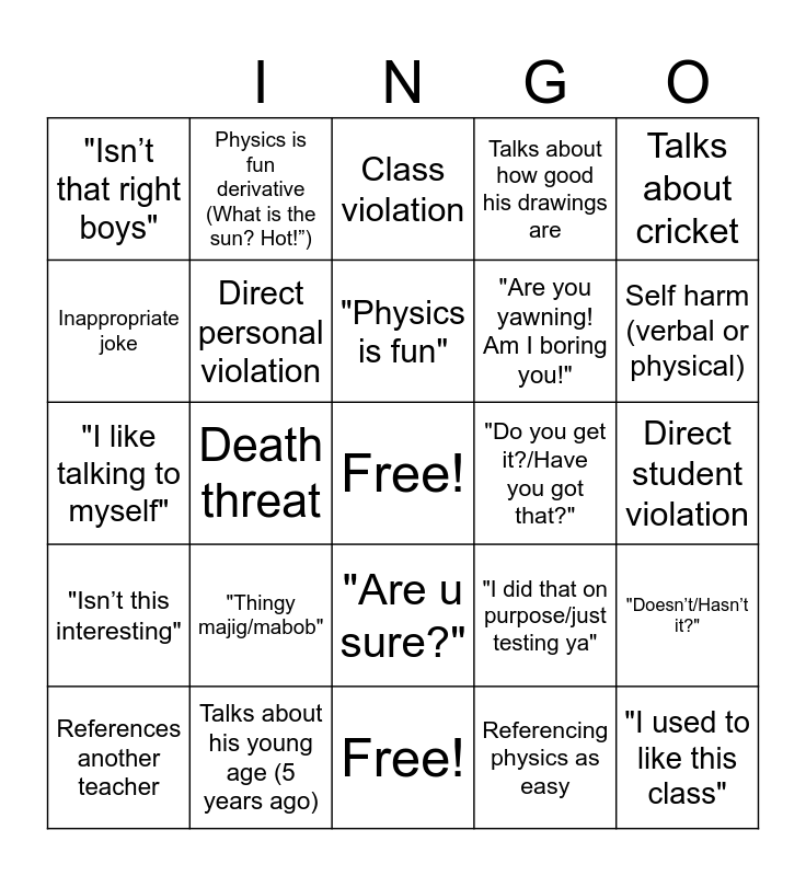 This bingo card has a free space and 24 words: "Thingy majig/mabob", Talks about his young age (5 years ago), "Physics is fun", References another teacher, Talks about cricket, "Isn’t that right boys", Inappropriate joke, Physics is fun derivative (What is the sun? Hot!”), "Do you get it?/Have you got that?", "Are u sure?", "Are you yawning! Am I boring you!", "I like talking to myself", "I did that on purpose/just testing ya", "Doesn’t/Hasn’t it?", Direct personal violation, Referencing physics as easy, Direct student violation, Class violation, Self harm (verbal or physical), Death threat, "I used to like this class", "Isn’t this interesting", Talks about how good his drawings are and Free!.