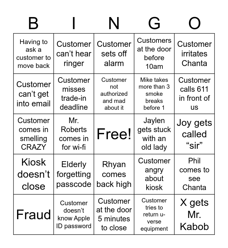 This bingo card has a free space and 24 words: Elderly forgetting passcode, Customer doesn’t know Apple ID password, Customer not authorized and mad about it, Fraud, Customer irritates Chanta, Having to ask a customer to move back, Customer can’t get into email, Customer can’t hear ringer, Jaylen gets stuck with an old lady, Rhyan comes back high, Mike takes more than 3 smoke breaks before 1, Customer comes in smelling CRAZY, Customer angry about kiosk, Phil comes to see Chanta, Customer misses trade-in deadline, Customer tries to return u-verse equipment, Joy gets called “sir”, Customer sets off alarm, Customer calls 611 in front of us, Mr. Roberts comes in for wi-fi, X gets Mr. Kabob, Kiosk doesn’t close, Customers at the door before 10am and Customer at the door 5 minutes to close.