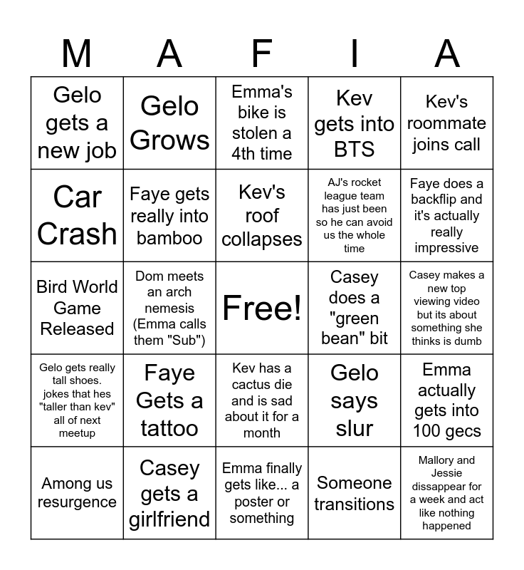 This bingo card has a free space and 24 words: Faye Gets a tattoo, Casey gets a girlfriend, Kev's roof collapses, Among us resurgence, Kev's roommate joins call, Gelo gets a new job, Car Crash, Gelo Grows, Casey does a "green bean" bit, Kev has a cactus die and is sad about it for a month, AJ's rocket league team has just been so he can avoid us the whole time, Bird World Game Released, Gelo says slur, Emma actually gets into 100 gecs, Faye gets really into bamboo, Someone transitions, Casey makes a new top viewing video but its about something she thinks is dumb, Emma's bike is stolen a 4th time, Faye does a backflip and it's actually really impressive, Dom meets an arch nemesis (Emma calls them "Sub"), Mallory and Jessie dissappear for a week and act like nothing happened, Gelo gets really tall shoes. jokes that hes "taller than kev" all of next meetup, Kev gets into BTS and Emma finally gets like... a poster or something.