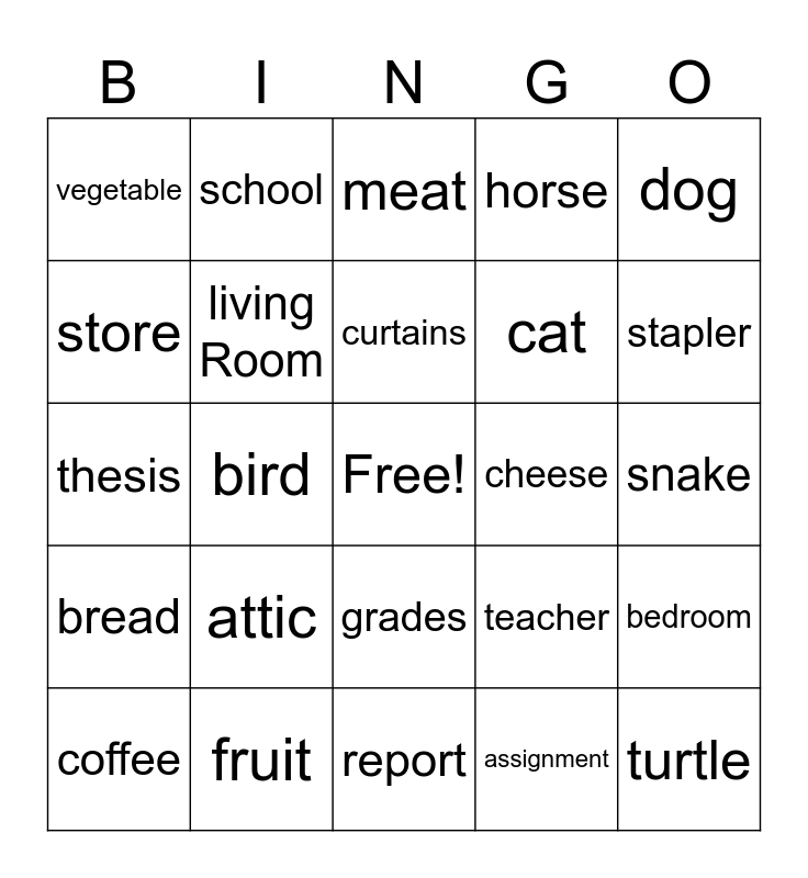 This bingo card has a free space and 38 words: bathroom, dishwasher, refrigerator, living Room, bedroom, attic, curtains, dinner table, dog, cat, bird, horse, turtle, snake, store, bread, potato, meat, milk, cheese, vegetable, fruit, stapler, coffee, printer, report, boss, coworker, office, salary, pencil, grades, assignment, school, textbook, teacher, thesis and school break.