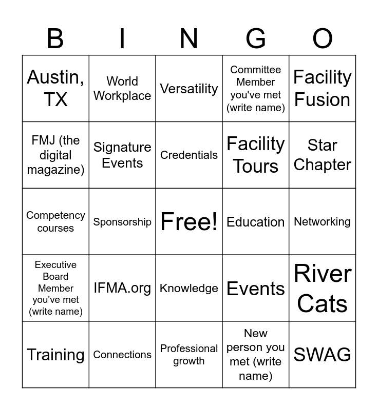 This bingo card has a free space and 25 words: IFMA.org, Professional growth, Credentials, Training, Facility Fusion, Austin, TX, FMJ (the digital magazine), World Workplace, Education, Knowledge, Facility Tours, Competency courses, Events, River Cats, Signature Events, Community, Networking, Versatility, Star Chapter, Sponsorship, SWAG, Connections, Executive Board Member you've met (write name), Committee Member you've met (write name) and New person you met (write name).