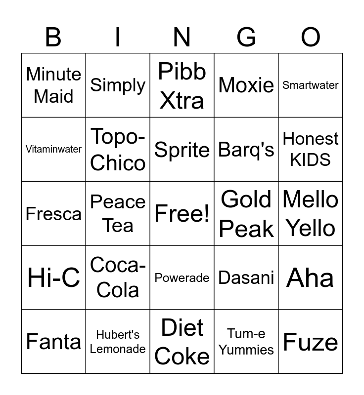 This bingo card has a free space and 25 words: Coca-Cola, Diet Coke, Sprite, Fanta, Smartwater, Minute Maid, Vitaminwater, Simply, Gold Peak, Powerade, Barq's, Fresca, Dasani, Aha, Topo-Chico, Seagram's, Mello Yello, Pibb Xtra, Honest KIDS, Peace Tea, Fuze, Hubert's Lemonade, Hi-C, Moxie and Tum-e Yummies.