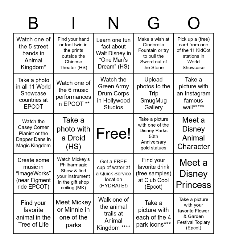 This bingo card has a free space and 24 words: Watch Mickey’s Philharmagic Show & find your instrument in the gift shop ceiling (MK), Meet Mickey or Minnie in one of the parks, Watch the Green Army Drum Corps in Hollywood Studios, Find your favorite animal in the Tree of Life, Pick up a (free) card from one of the 11 KidCot stations in World Showcase, Watch one of the 5 street bands in Animal Kingdom*, Take a photo in all 11 World Showcase countries at EPCOT, Find your hand or foot twin in the prints outside the Chinese Theater (HS), Take a picture with one of the Disney Parks 50th Anniversary gold statues, Get a FREE cup of water at a Quick Service location (HYDRATE!), Upload photos to the Trip SmugMug Gallery, Watch the Casey Corner Pianist or the Dapper Dans in Magic Kingdom, Find your favorite drink (free samples) at Club Cool (Epcot), Meet a Disney Princess, Watch one of the 6 music performances in EPCOT **, Take a picture with each of the 4 park icons***, Meet a Disney Animal Character, Learn one fun fact about Walt Disney in “One Man’s Dream” (HS), Take a picture with an Instagram famous wall*****, Take a photo with a Droid (HS), Take a picture with your favorite Flower & Garden Festival Topiary (Epcot), Create some music in “ImageWorks” (near Figment ride EPCOT), Make a wish at Cinderella Fountain or try to pull the Sword out of the Stone and Walk one of the animal trails at Animal Kingdom ****.