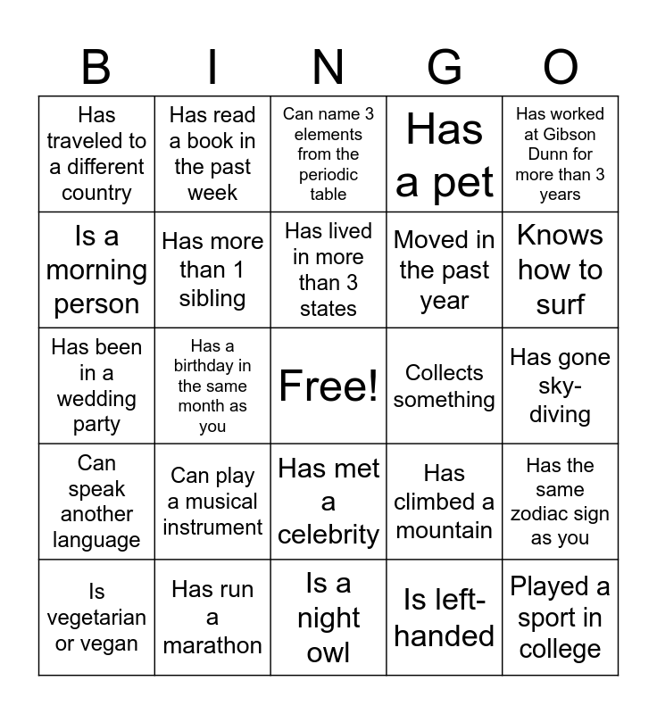 This bingo card has a free space and 24 words: Can play a musical instrument, Has run a marathon, Has lived in more than 3 states, Is vegetarian or vegan, Has worked at Gibson Dunn for more than 3 years, Has traveled to a different country, Is a morning person, Has read a book in the past week, Collects something, Has met a celebrity, Moved in the past year, Has been in a wedding party, Has climbed a mountain, Has the same zodiac sign as you, Has more than 1 sibling, Is left-handed, Has gone sky-diving, Can name 3 elements from the periodic table, Knows how to surf, Has a birthday in the same month as you, Played a sport in college, Can speak another language, Has a pet and Is a night owl.