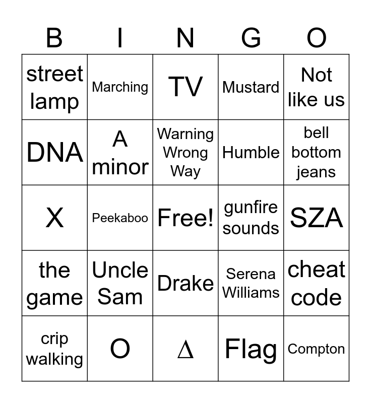 This bingo card has a free space and 24 words: Uncle Sam, O, Warning Wrong Way, crip walking, Not like us, street lamp, DNA, Marching, gunfire sounds, Drake, Humble, X, Serena Williams, cheat code, A minor, Flag, SZA, TV, bell bottom jeans, Peekaboo, Compton, the game, Mustard and ∆.