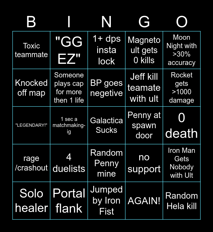 This bingo card has a free space and 45 words: Random Hawkeye headshot, Random Hela kill, Lord Spiderman, Solo healer, Team Wipe, AGAIN!, 1+ dps insta lock, Warlock dies in the middle of his ult, Moon Night with >30% accuracy, Portal flank, Magneto ult gets 0 kills, Penny at spawn door, Random Penny mine, 4 duelists, Insta-lock Psylocke, Jumped by Iron Fist, DPS healer, "LEGENDARY!", Warlock resurrect 4+ allies, Rocket gets >1000 damage, "GG EZ", "Heal diff", "Dps diff", Toxic teammate, 0 kill, 0 death, 0 and 10+ (Self), MVP, no support, rage /crashout, Mr. fantastic dies durring ult, Iron Man Gets Nobody with Ult, 0 and 10+ (Teamate), "By the eye of Agamotto", ACE, 1 sec a matchmaking-ig, "YOUR POWERS ARE MINE", 15k damage, 10k heal, BP goes negetive, Knocked off map, Jeff kill teamate with ult, Wanda dies mid-ult, Someone plays cap for more then 1 life and Random Moon Knight Kill.