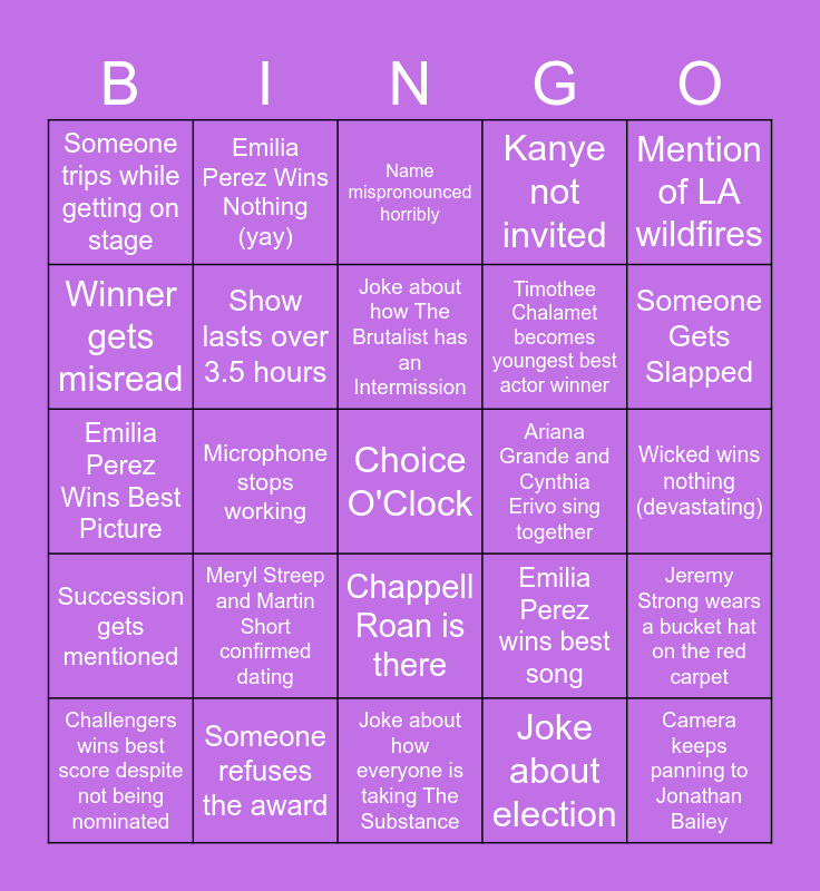 This bingo card has a free space and 24 words: Meryl Streep and Martin Short confirmed dating, Someone refuses the award, Joke about how The Brutalist has an Intermission, Challengers wins best score despite not being nominated, Mention of LA wildfires, Someone trips while getting on stage, Winner gets misread, Emilia Perez Wins Nothing (yay), Ariana Grande and Cynthia Erivo sing together, Chappell Roan is there, Timothee Chalamet becomes youngest best actor winner, Emilia Perez Wins Best Picture, Emilia Perez wins best song, Jeremy Strong wears a bucket hat on the red carpet, Show lasts over 3.5 hours, Joke about election, Wicked wins nothing (devastating), Name mispronounced horribly, Someone Gets Slapped, Microphone stops working, Camera keeps panning to Jonathan Bailey, Succession gets mentioned, Kanye not invited and Joke about how everyone is taking The Substance.