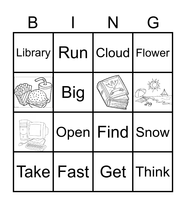 This bingo card has 10 images and 28 words: Snow, Flower, Take, Get, Big, Think, Mirror, Cloud, Give, Fast, Library, Light, Open, Do, Happy, Simple, Bird, Large, Know, Butterfly, Mountain, Easy, Say, Run, Guitar, Hot, Find and Make.